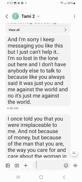 Here's just a few screenshots of messages she's sent. There's plenty more. In some others she talks about him shoving her around, threatening to put her out of the truck, etc. Maybe he's on to something about her. Who knows?