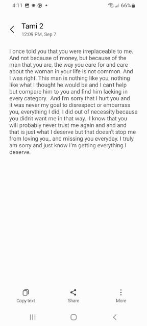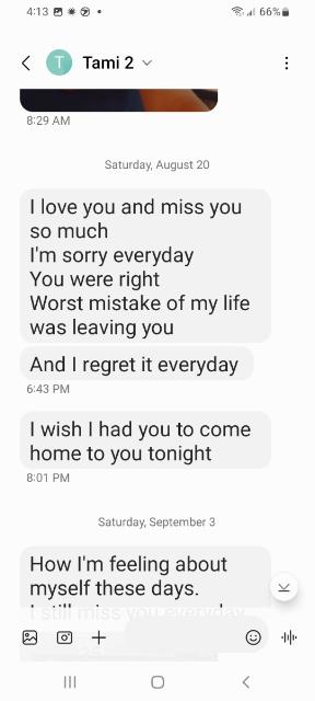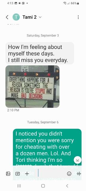 Who knows how many others there've been. She told me she was upset that her friend who told me about her cheating had "put that shit in my head", as if there was no truth to any of it. If you ask Tami, she doesn't regret any of it after finally getting her to admit to it.