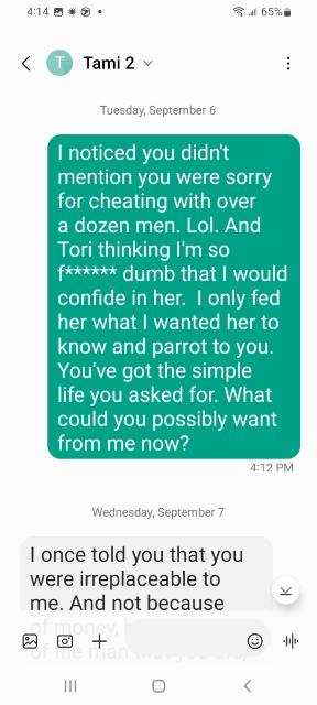 Here's where her game started falling apart. In 2020 I was doing a duct job and Tami's ex came out to help me. In the course of a conversation he told me he had been with one of the women in the recordings, after the divorce. I happened to mention it to Tami several months later. I could tell she wasn't happy about it, but she really didn't carry on. Little did I know, she was VERY pissed off about this.